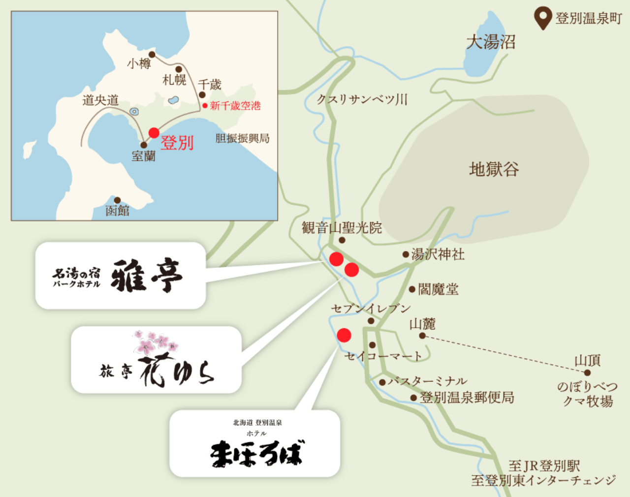 | 旭川から | 旭川 → 登別温泉 約3時間(高速道路利用) |